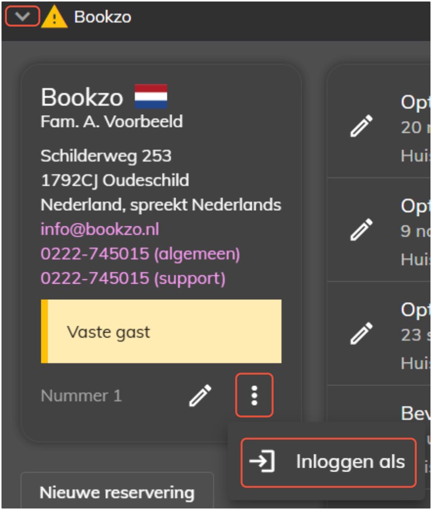Als beheerder / gebruiker kun je ook meekijken in de Mijn omgeving van de gast. Kan een gast bijvoorbeeld iets niet vinden in zijn omgeving dan kun je even meekijken of het klopt dat er iets niet staat. Dit is ook handig als de gast bijvoorbeeld, in geval van eerder voorbeeld, de kopie van de rijbewijs mailt. Dan kun je via deze manier ook gemakkelijk de bijlage uploaden in de gastomgeving. Ga naar Bookzo Web en klik in de menubalk op Gasten. Selecteer in het overzicht de gast waarvan je de omgeving wilt zien en druk op het wijzig-incoontje (pennetje). Vervolgens kies je voor 'Inloggen als'.