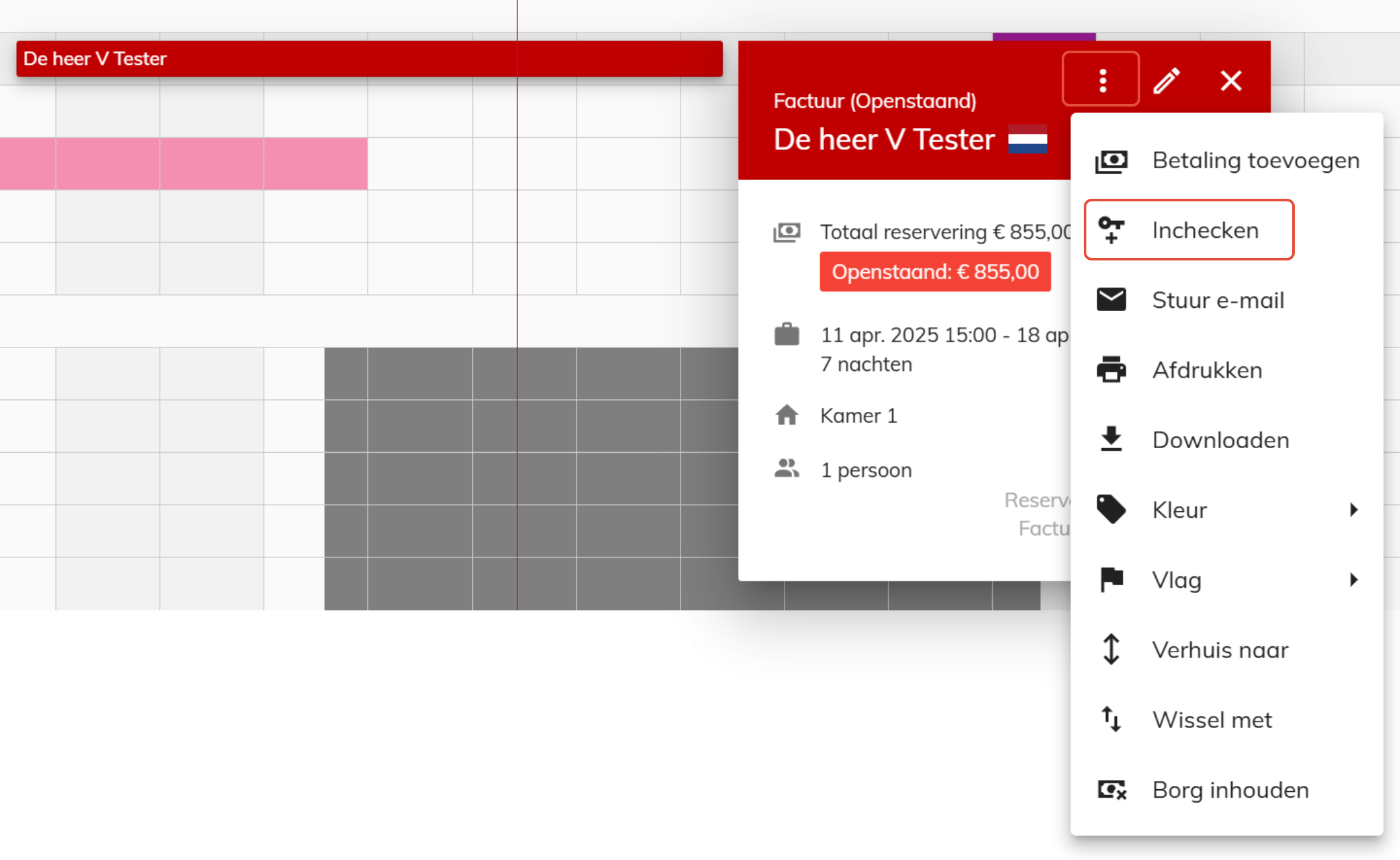 Klik op de reservering en vervolgens op de 3 puntjes om het snelmenu te openen.