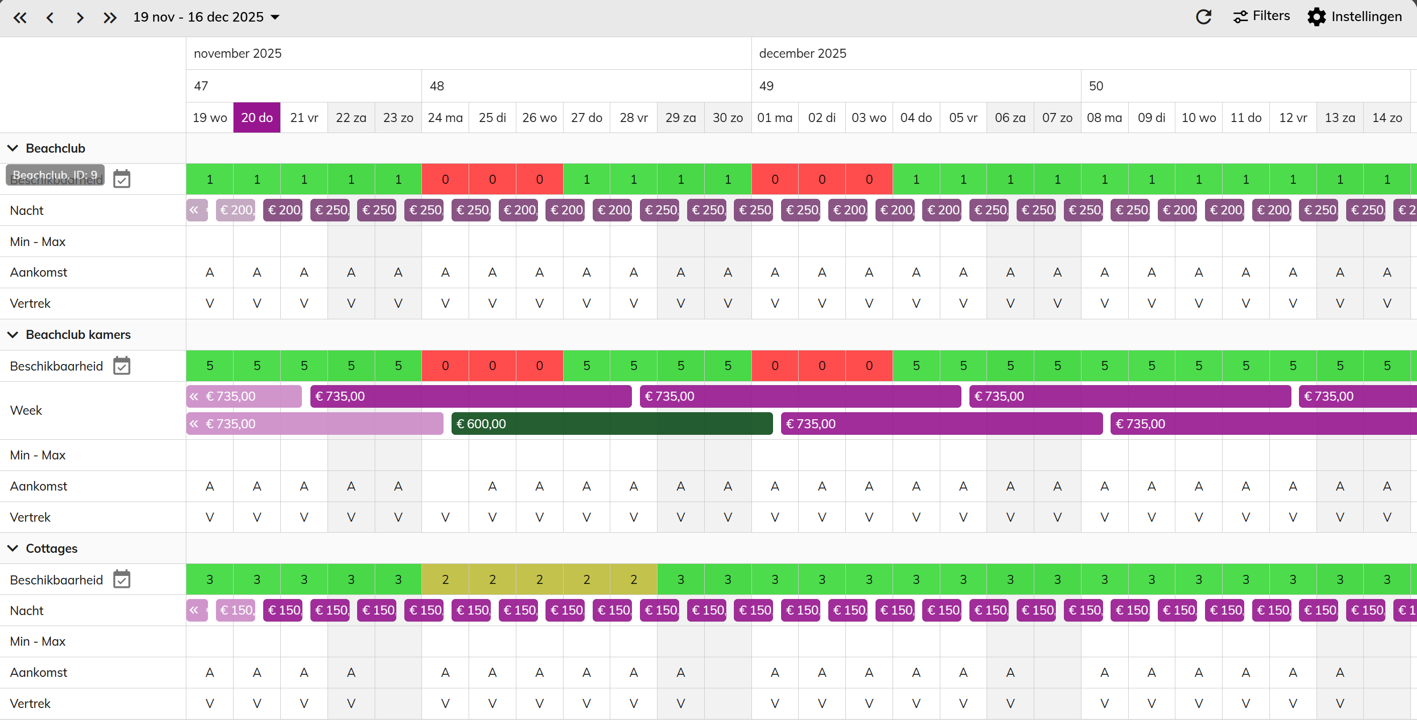In het Yield overzicht zie je de velden die je aan hebt gezet in de instellingen. Bij beschikbaarheid zie jein een heatmap hoeveel van welke accommodatie je nog beschikbaar hebt. Groen is vrij, rood is bezet.