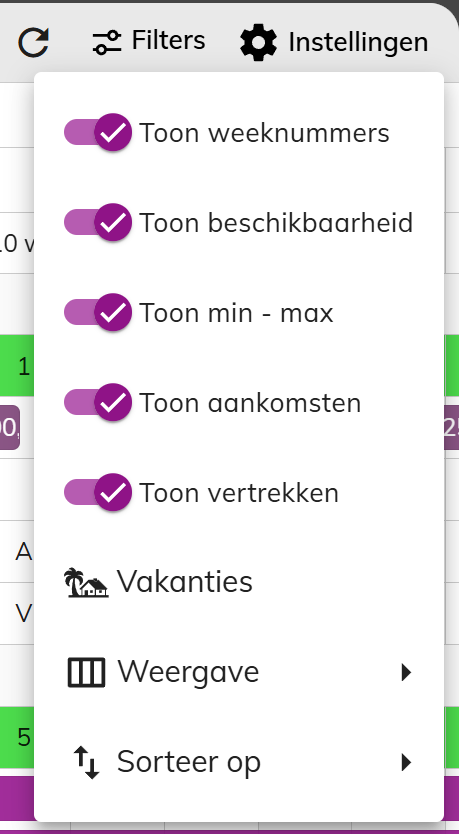 Wil je bijvoorbeeld een prijs overzicht maar niet een overzicht van de aankomst dagen of gebruik je geen min/ max stay, dan kun je deze gewoon uitzetten.