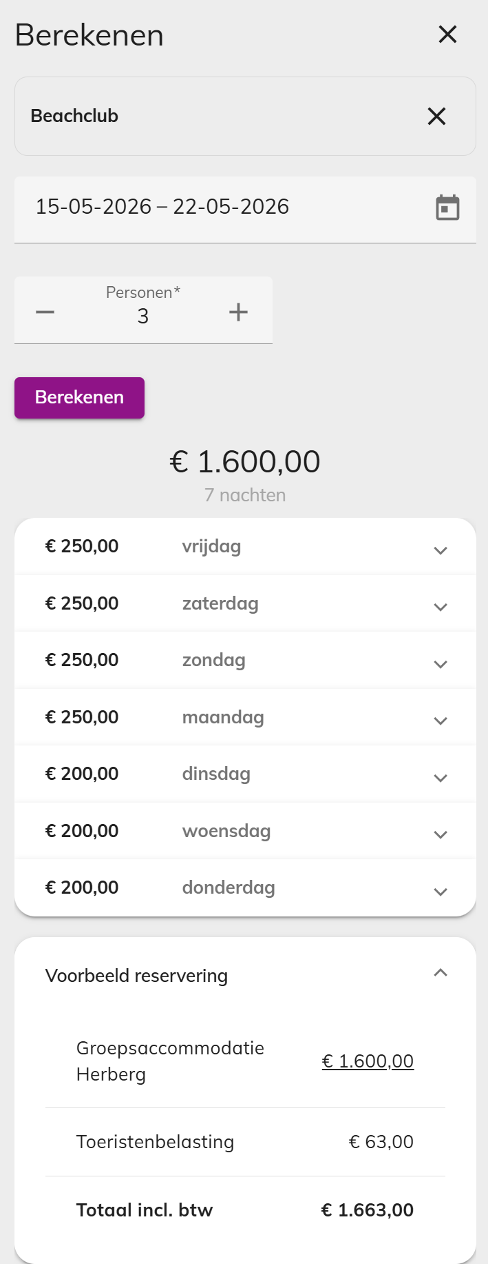 Klik je op de berekentool dan krijg je een venster te zien waarbij je of de accommodatie of de groep kunt selecteren en zo ook de datum en aantal personen. Het programma toont je de prijs opbouw van deze periode.