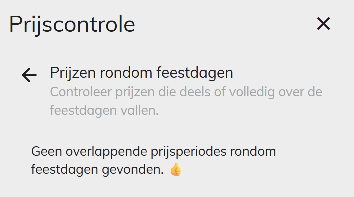 Deze tool toont overlappende prijzen binnen de accommodatie rondom de feestdagen en ontbrekende prijzen.